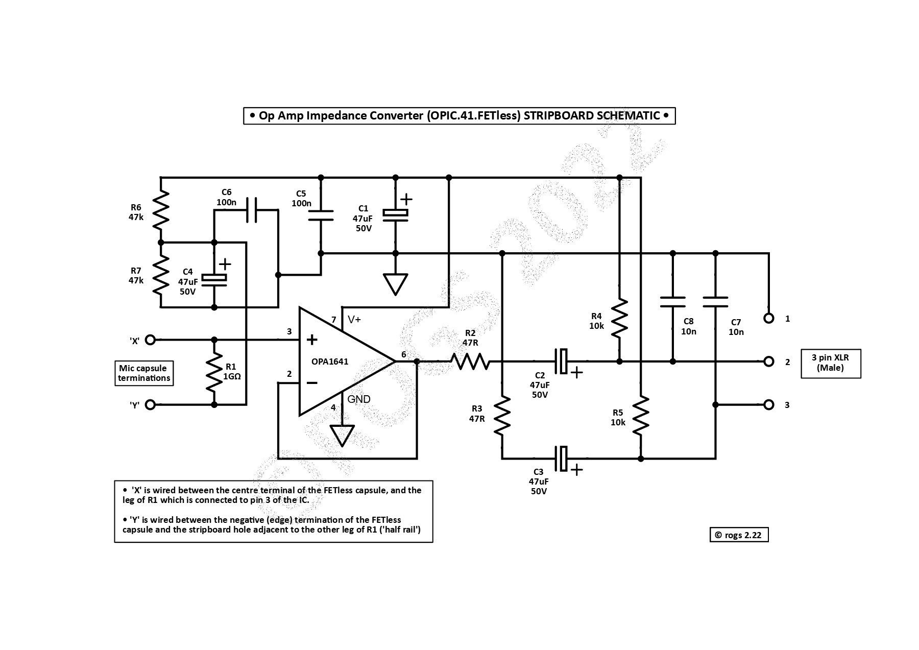This most simple application using the OPA1641 opamp only includes 2 resistors in the signal path - R1 and R2. This will help to minimise any noise generated by the circuitry, and should allow for microphone with a self noise level of only around 8dB (A-weighted) to be created.