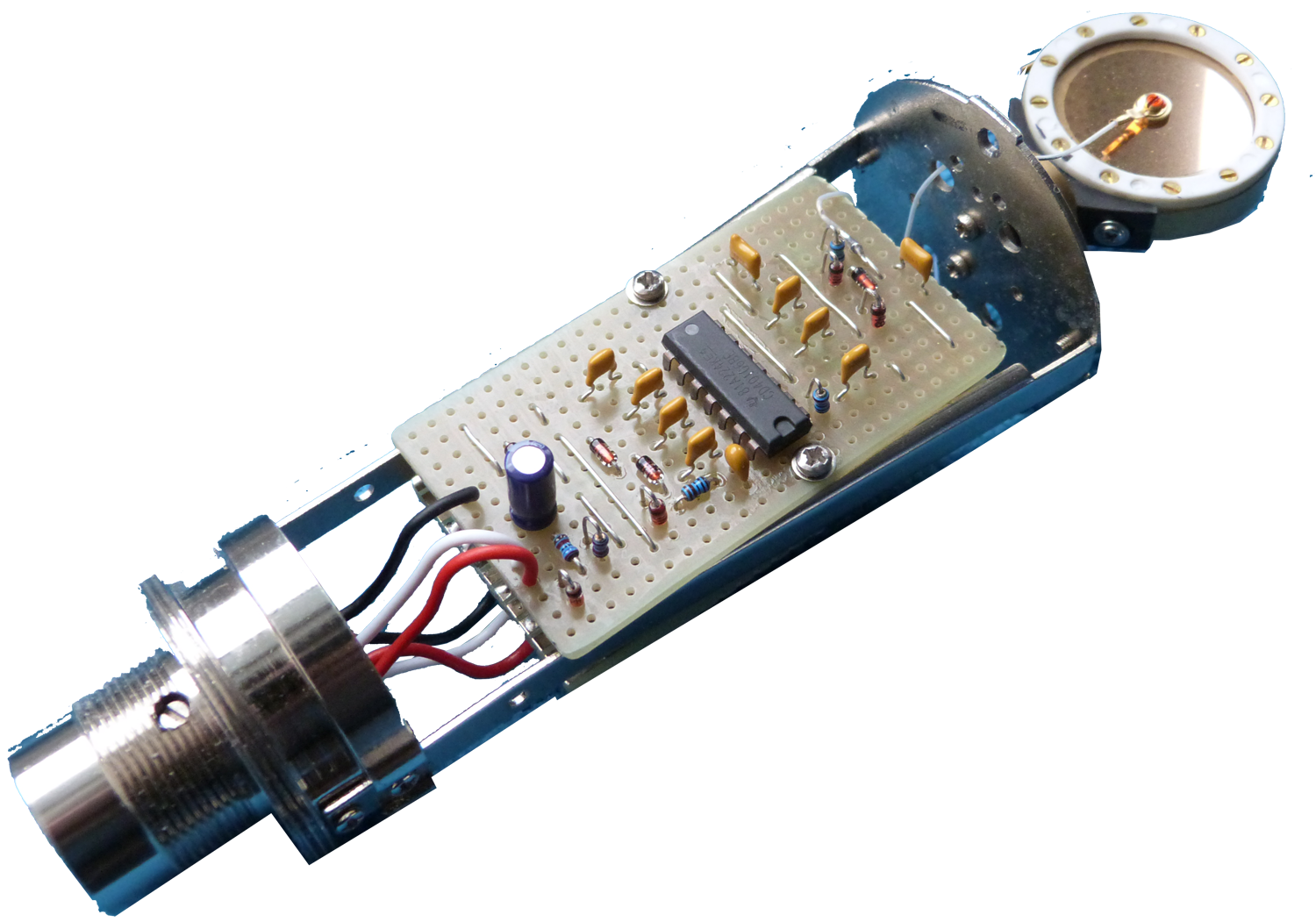 The schematic above shows the audio circuitry required to interface a conventional (non-electret) large diameter condenser microphone capsule - 'LDC' - to a microphone pre-amp fitted wih 48v phantom power.