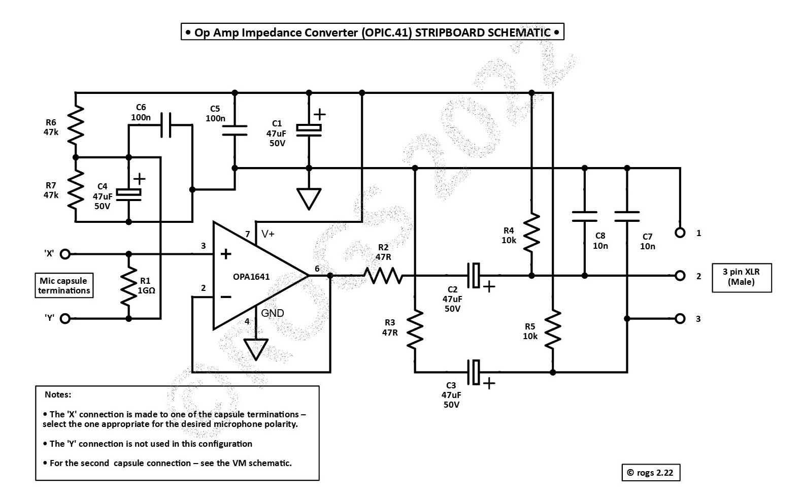 The circuitry includes an impedance converter - utilising an OPA1641 op-amp - and appropriate output coupling capacitors and resistors.