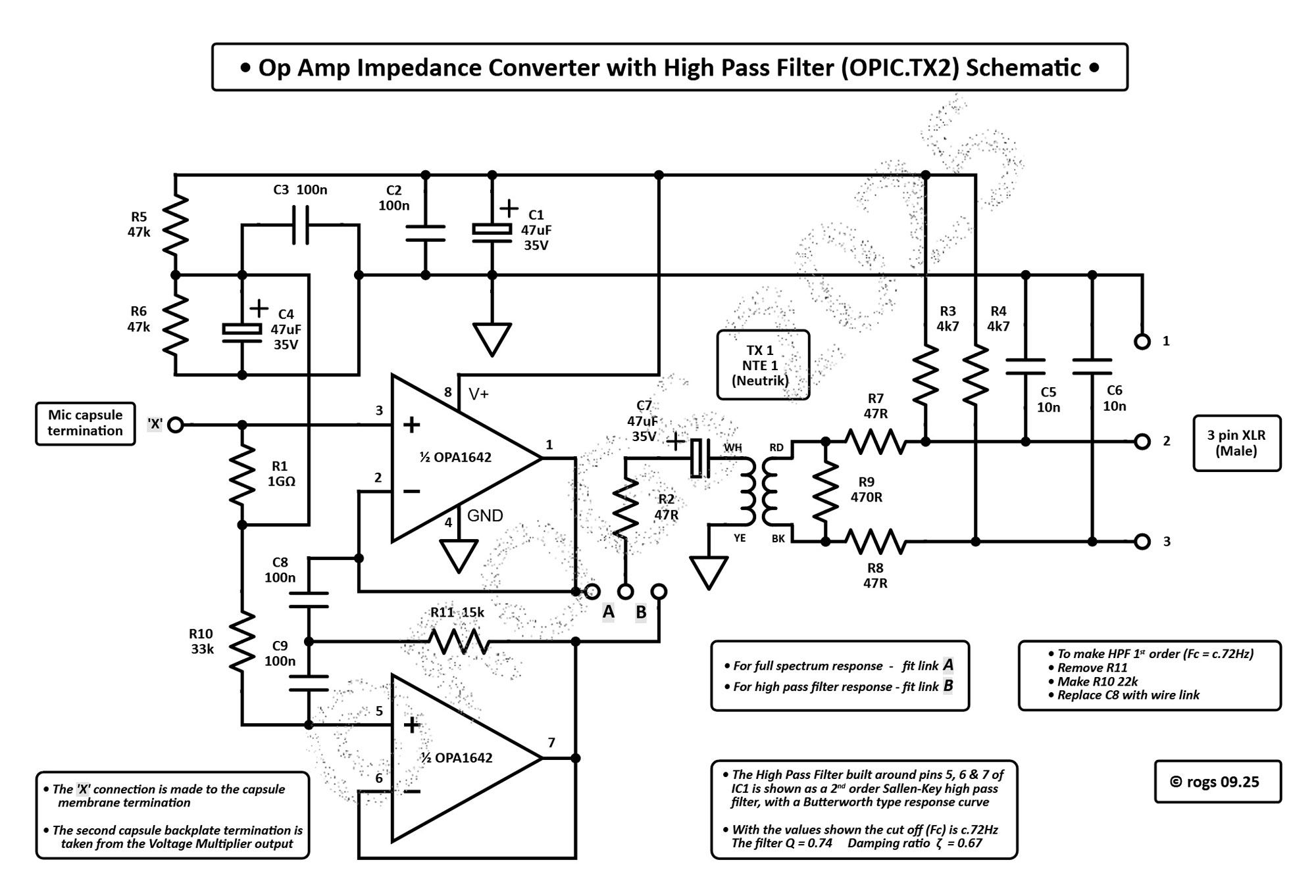 • The TX2 version also includes an optional Butterworth 2nd order high pass filter, which may be configured from the positioning of a single link on the stripboard.