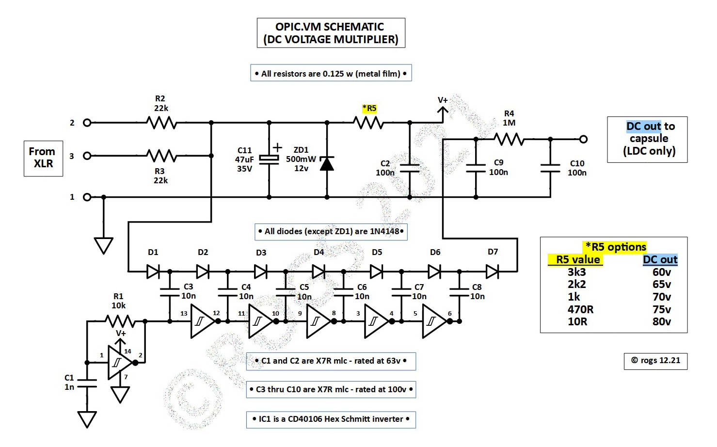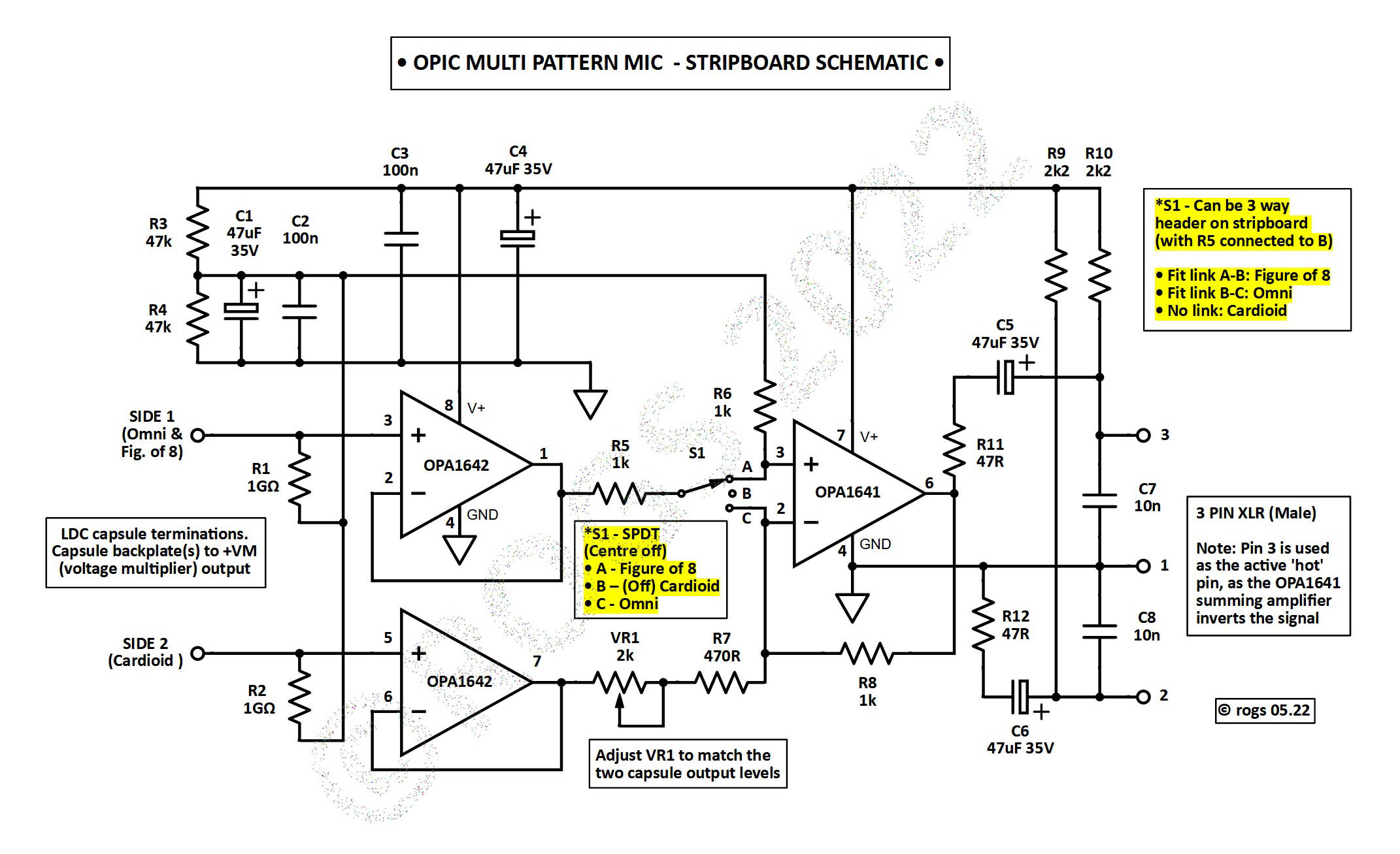 The schematic above shows the audio circuitry required to create a Multi-Pattern condenser microphone, utilising a dual sided large diameter microphone capsule - 'LDC' - interfaced with a microphone pre-amp, fitted wih 48v phantom power.
